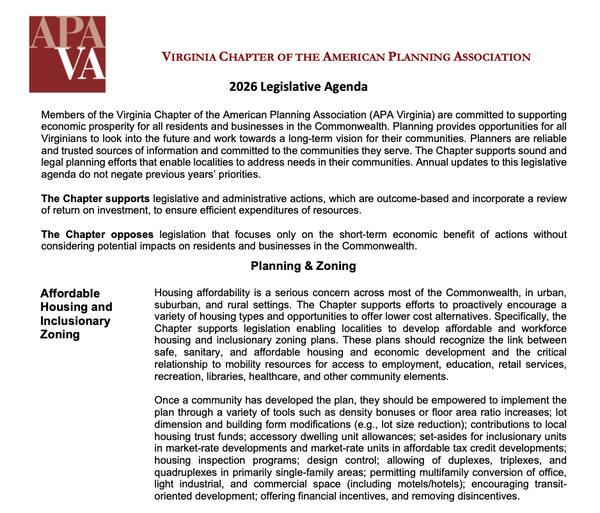 The Board of the Virginia Chapter of the American Planning Association met on Friday, April 11th, for our quarterly meeting and took some time to discuss the Chapter's position on diversity, equity and inclusion. It was an emotional conversation as the topic has been front and center of conversations in the political environment of 2025. Here's the Board's statement on its position stemming from that conversation.